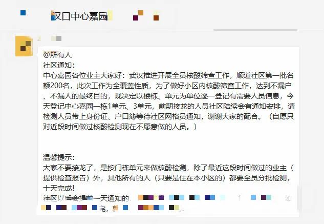 随后,记者来到硚口区水厂社区的融侨锦江小区,虽然这里不是重点筛查的老旧小区,但前期感染率高,先后有40多例确诊病例,所以,在接到大会战通知后,小区迅速行动,设置检测通道,采取“一条路线,进口只进不出,不逗留,不聚集”的检验形式。