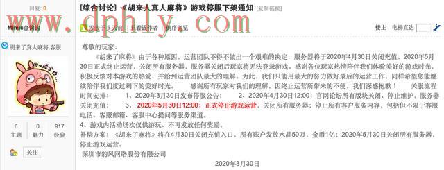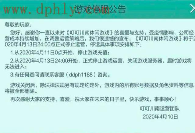 4月10日,《叮叮川南休闲游戏》发布公告,计划在4月13日停运;