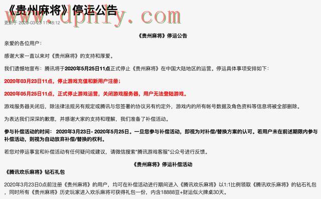 其中腾讯方面表示,将于3月23日11点开始停止《贵州麻将》游戏充值和新用户注册,今年5月25日11点停止其在中国大陆地区的运营;