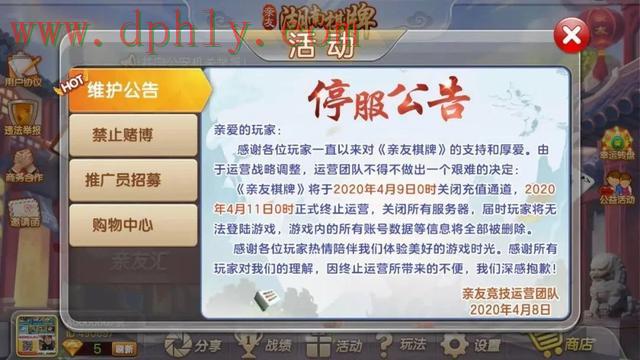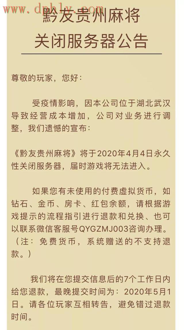 武汉多游科技旗下《黔友贵州麻将》将于2020年4月4日永久性关闭服务器;