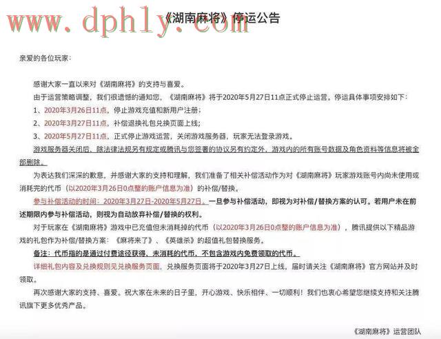另一款《湖南麻将》也会在5月27日11点关停,3月26日起停止游戏充值和新用户注册;