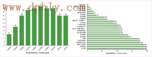 正月初一开始,棋牌游戏名次集体提升,随后的五天分别有10款、16款、19款、20款、21款棋牌跻身Top 100。《微乐家乡麻将》、《四川麻将》、《哈灵麻将》等地方棋牌一度跻身Top 20。