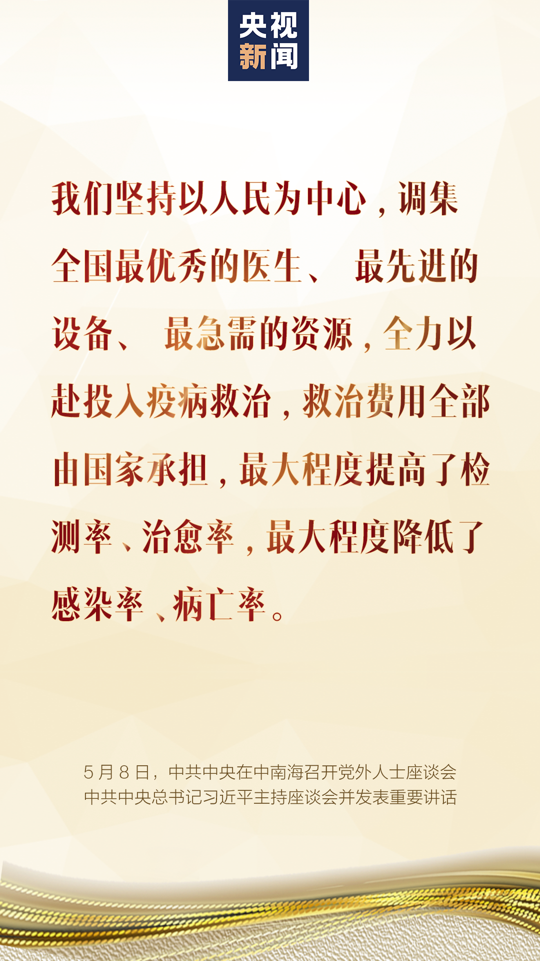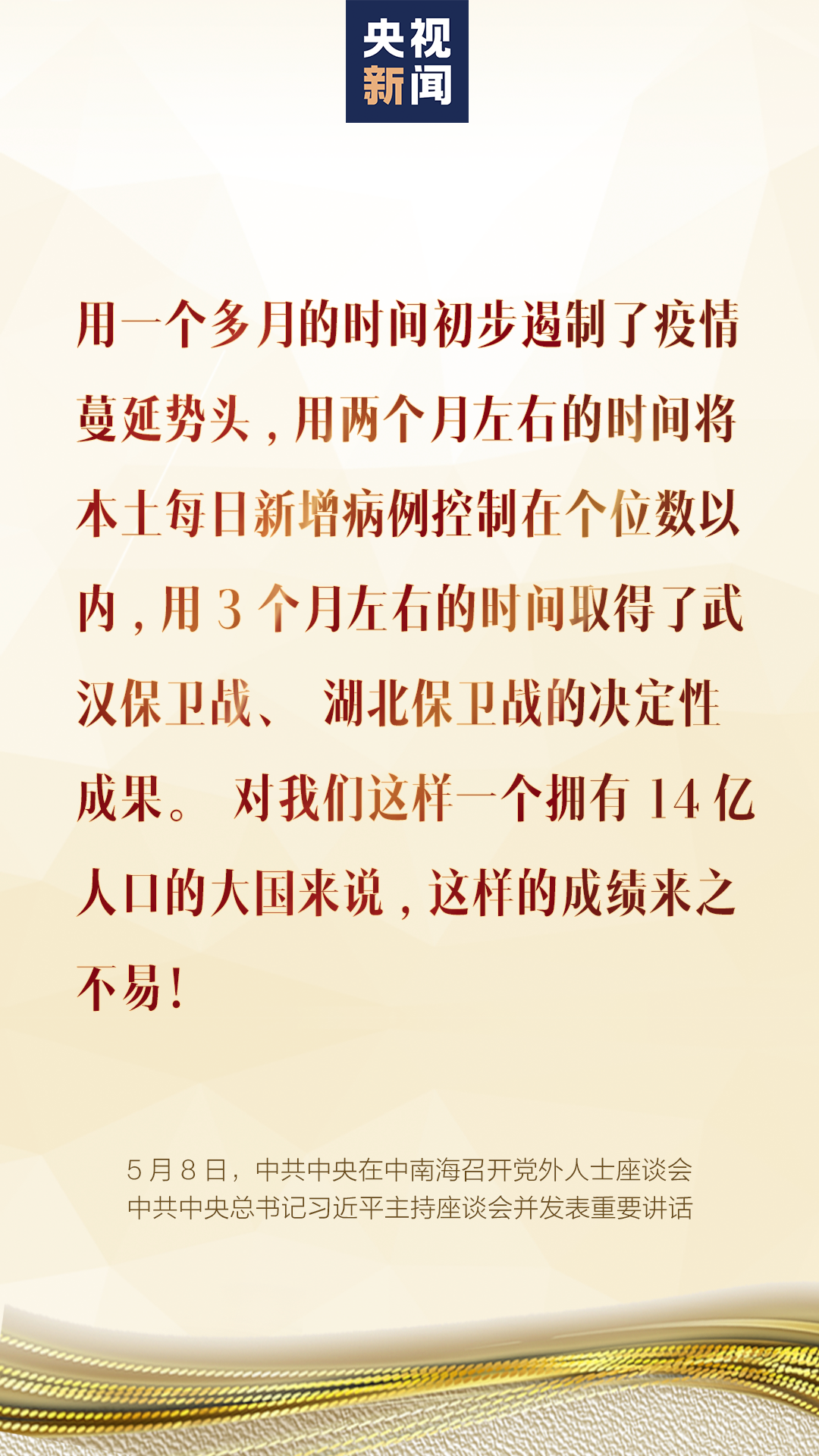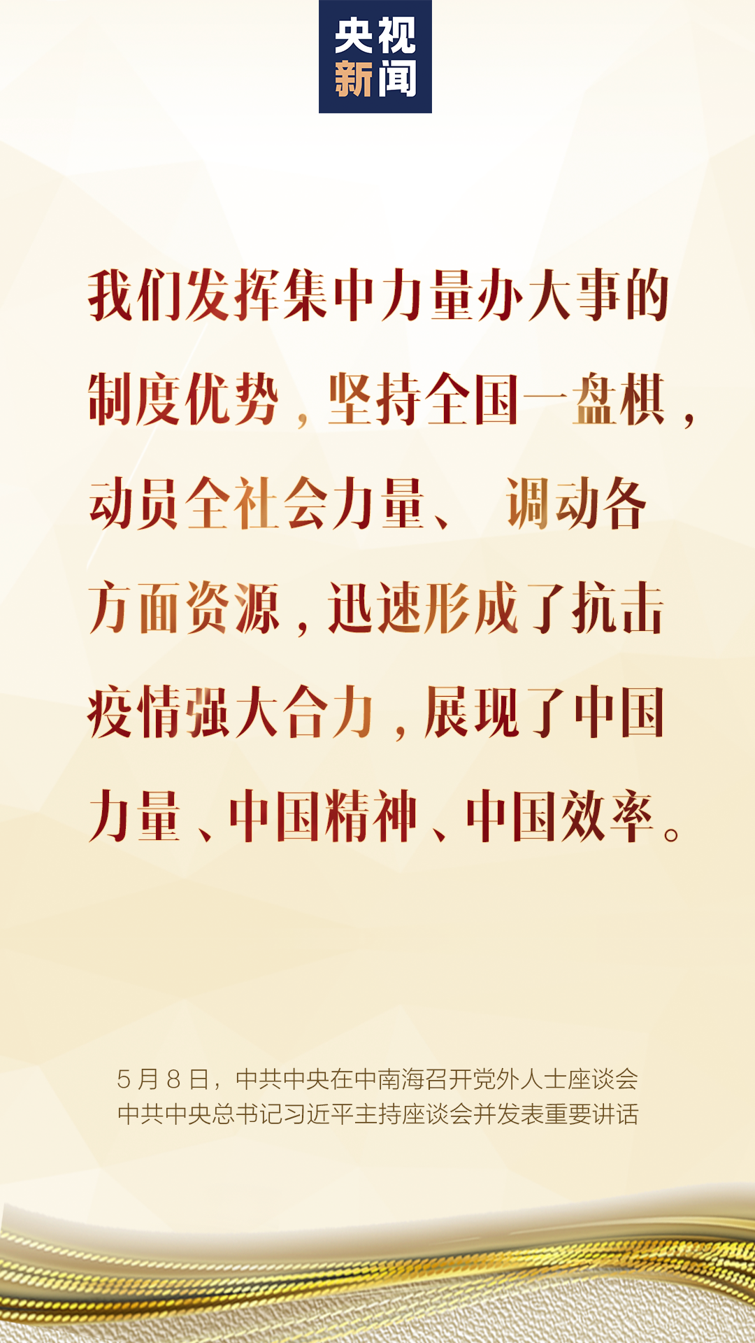 5月8日,中共中央在中南海召开党外人士座谈会,就新冠肺炎疫情防控工作听取各民主党派中央、全国工商联和无党派人士代表的意见和建议。中共中央总书记习近平主持座谈会并发表重要讲话。