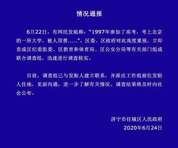 近日,山东济宁农家女苟晶网上发帖,称23年前疑两次上大学遭顶替。6月24日,济宁市任城区人民政府发布关于此事的情况通报。通报全文如下: