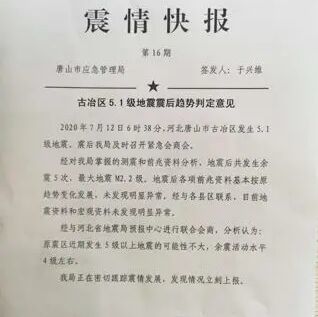 最新消息:今唐山市地震应属于1976年地震余震,且未造成人员和财产损失