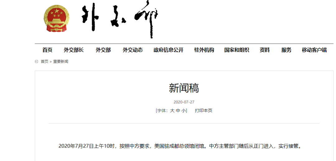 外交部消息,2020年7月27日上午10时,按照中方要求,美国驻成都总领馆闭馆。中方主管部门随后从正门进入,实行接管。