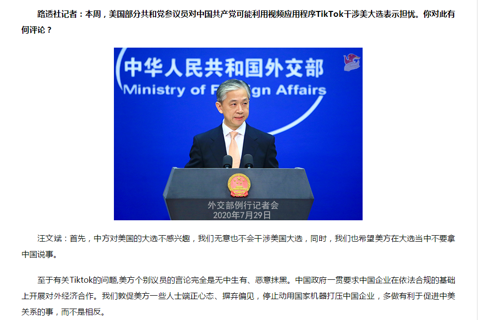 中方回应所谓“TikTok干预美国大选”:希望美方在大选当中不要拿中国说事