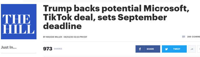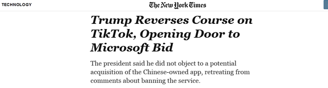 特朗普称,“我不在乎是微软买或是谁买,只要是一家大公司,一家安全的公司,一家非常美国的公司买下来就行,而且买整件东西可比只买其中30%要容易。”