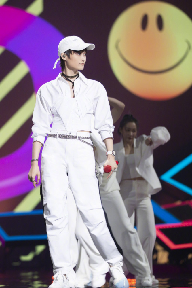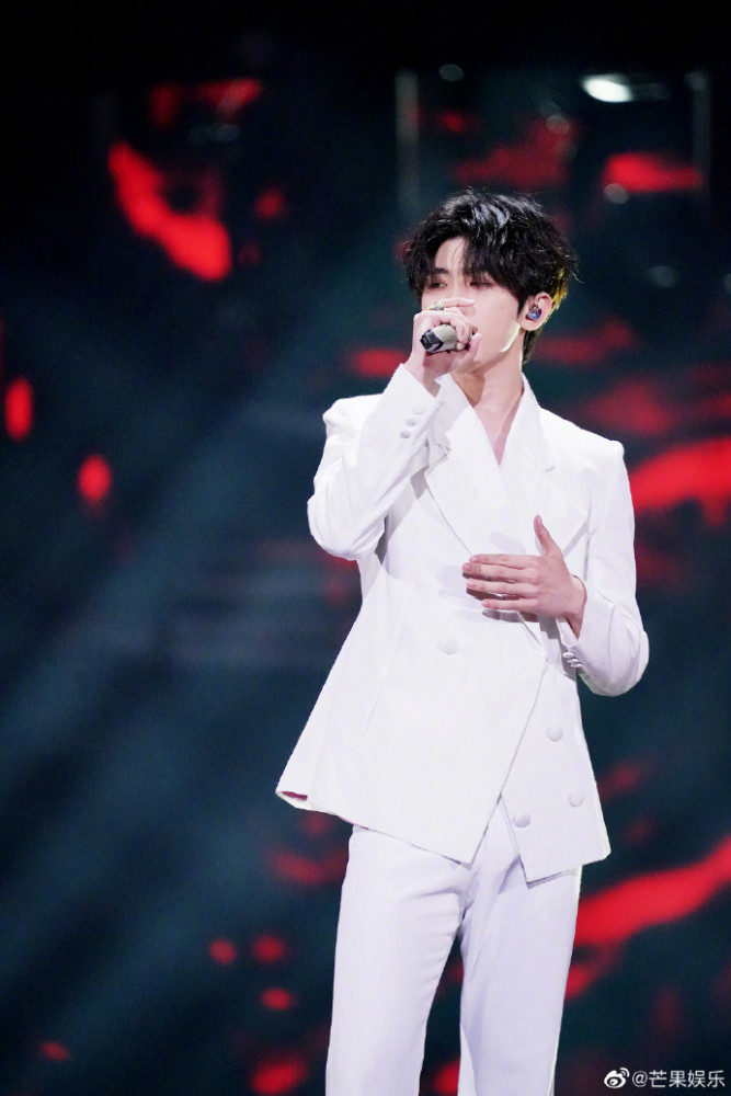 一身是白,挺拔帅气,气质卓越,上身白色背心外搭白色西装,下身穿是的白色喇叭裤,不仅具有很强的年代感,在重生舞台上更是光影交错,性感十足。