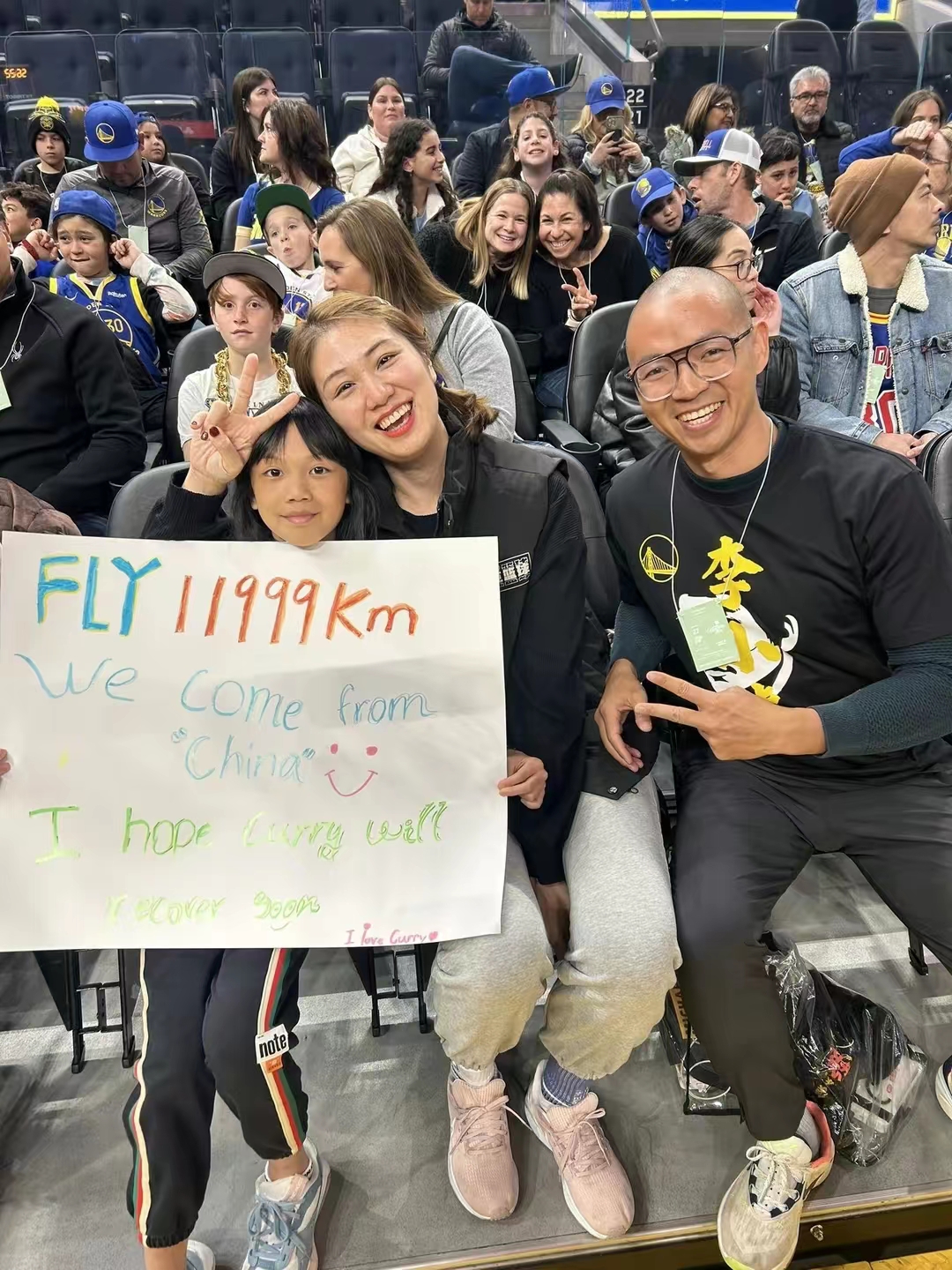 希望库里能看到这位中国球迷不远万里来现场看你的比赛,早日康复,实现他们的愿望。