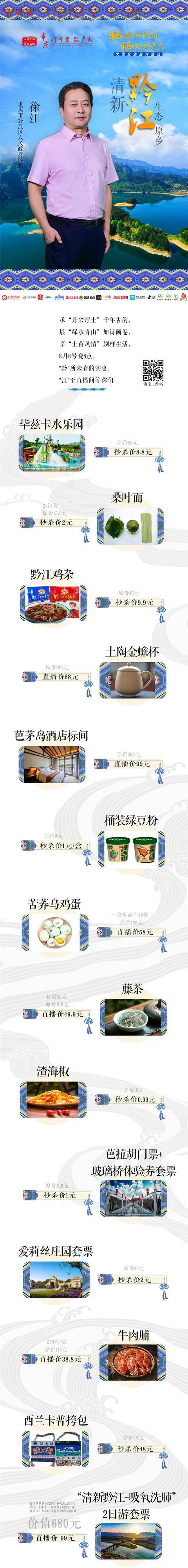 直播将在淘宝、抖音、上游新闻、华龙网、第一眼、腾讯看点、新浪微博、去哪儿旅行、重庆发布、网易重庆、中经云端、家在黔江 APP、黔江手机台、微黔江、视听黔江、黔江文旅微信公众号等平台同步开启。秒杀产品将于淘宝店铺“重庆文化旅游精品馆”上线开抢。